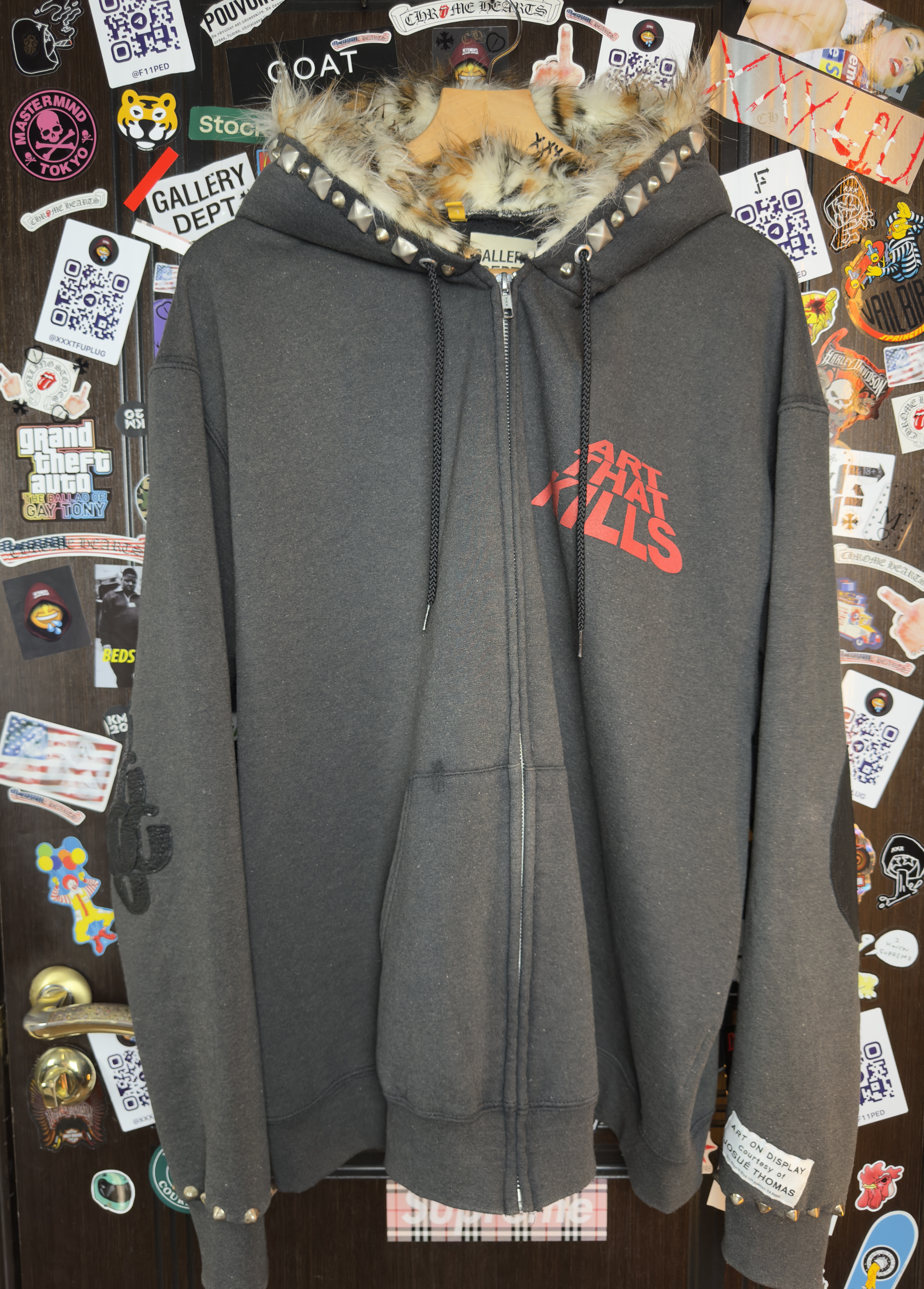 L SIZE WHITE STITCHES AROUND THE HOODIE FUR HOOD EXOTIC LEATHER PATCHES ON SLEEVES SWAGGY ONE